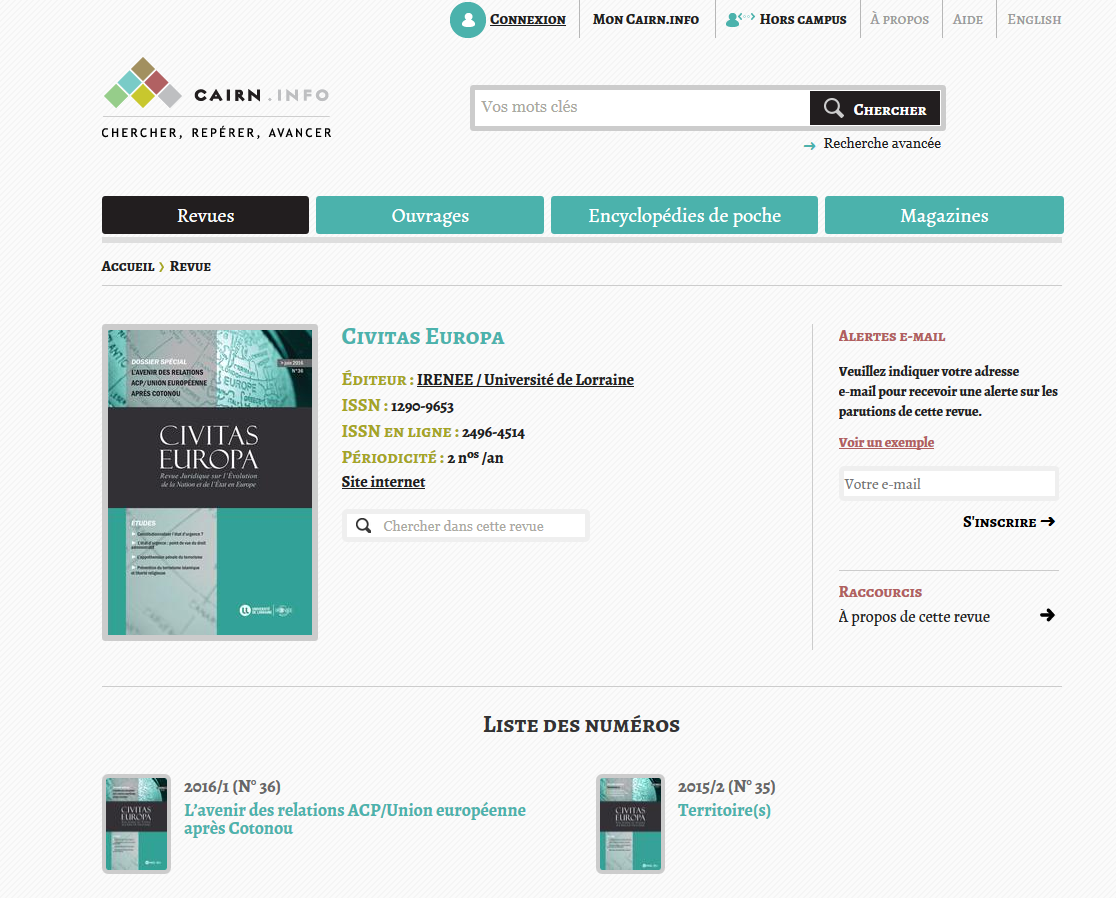 La revue Civitas Europa est une revue juridique traitant de l’évolution de la Nation et de l’État en Europe éditée par le laboratoire IRENEE de l'Université de Lorraine, diffusée par le laboratoire et en ligne sur la plateforme CAIRN avec un accès gratuit aux membres de l'Université de Lorraine. L’actualité est au cœur de la revue Civitas Europa.