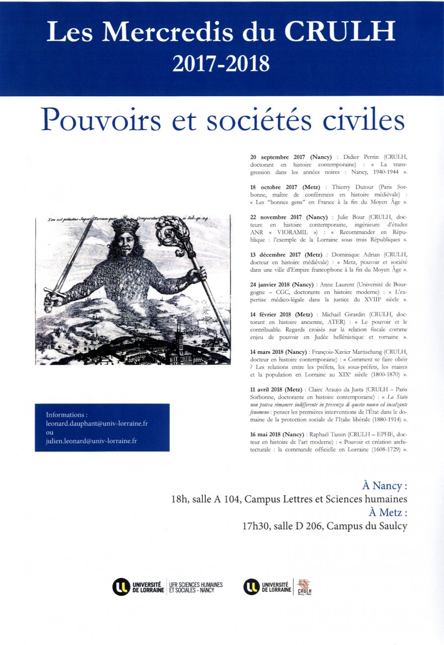 Un mercredi par mois, le CRULH (Centre de Recherche Universitaire Lorrain d'Histoire) invite alternativement à Metz et à Nancy un historien, pour présenter ses recherches, en lien avec l'actualité de la recherche historique, et pour dialoguer avec le public.