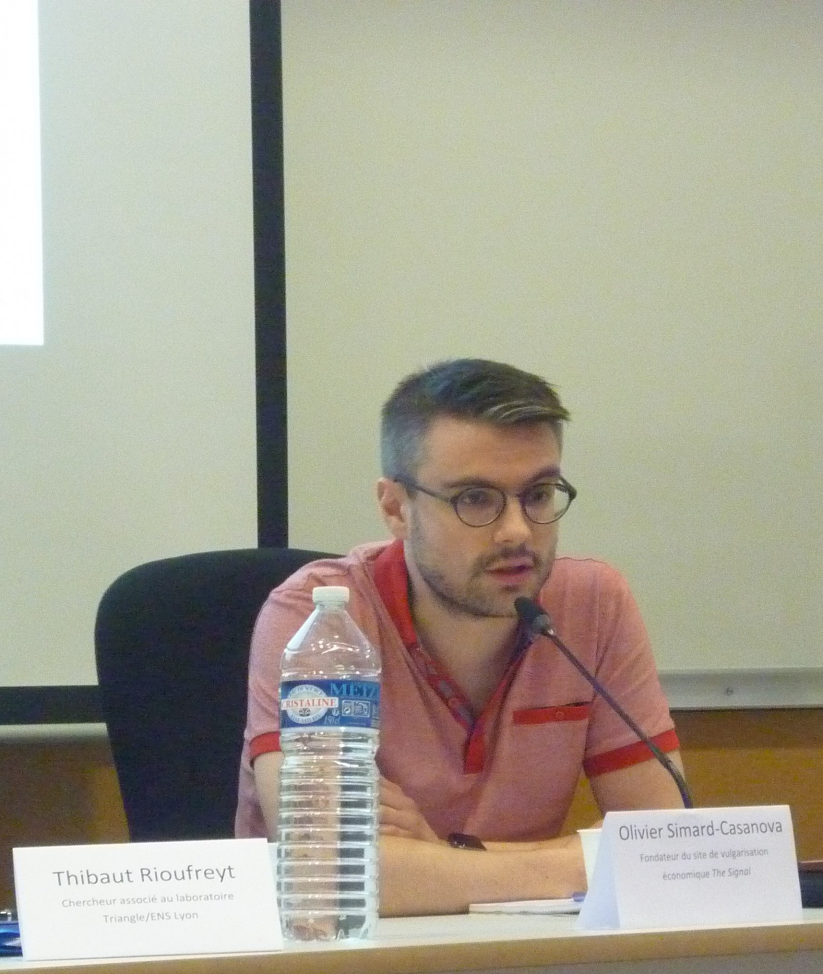 La journée de travail s’est terminée par une table-ronde. Ce fut au tour d’acteurs construisant ou utilisant les résultats de la recherche de se prononcer sur la thématique. Nathalie Griesbeck, députée européenne, Thibaut Rioufreyt, chercheur en science politique au laboratoire Triangle de Lyon, et Olivier Simard-Casanova, fondateur du site de vulgarisation économique « The Signal », étaient invités.