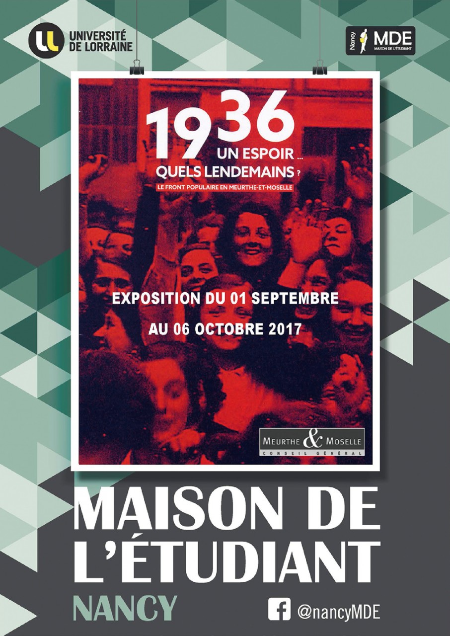 L’exposition «1936 un espoir ... quels lendemains» retrace 80 ans après son accession au pouvoir , les circonstances de l’avènement du Front populaire en Meurthe-et-Moselle , elle rappelle le contexte politique national et les spécificités départementales de cet avènement, au printemps 1936, en décline les principales mesures socio-économiques et leur mise en application au plan local et départemental. De la semaine de 40 heures aux deux semaines de congés payés, de l’extension des conventions collectives à l’institution de délégués du personnel, le gouvernement du Front populaire a remodelé en profondeur l’organisation des entreprises et du monde du travail et, par ce fait, des pans entiers de la société contemporaine. En dépit de réussites économiques avec, notamment, une décrue sensible du chômage, le Front populaire, victime de ses divisions internes, n’a su empêcher son échec politique et électoral dès 1937. Renseignements: Maison De l'Étudiant Nancy , 3 Place Godefroy de Bouillon 54000 NANCY Téléphone 03.72.74.06.50. Mail : dvuc-mde-nancy-contact@univ-lorraine.fr