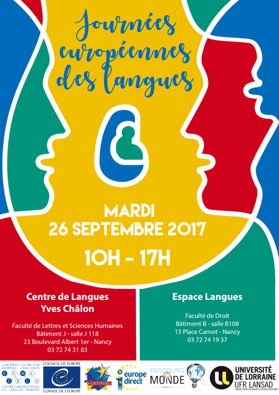 La Journée européenne des langues a lieu chaque année. Elle a été créée par le Conseil de l'Europe. Elle est l'occasion de sensibiliser le public à l'importance de l'apprentissage des langues et de promouvoir la richesse culturelle de l'Europe. Les centres de langues (Centre de Langues Yves Châlon et l'Espace Langues) de l’Université de Lorraine célèbreront la Journée Européenne des Langues le mardi 26 septembre prochain de 10h à 17h.