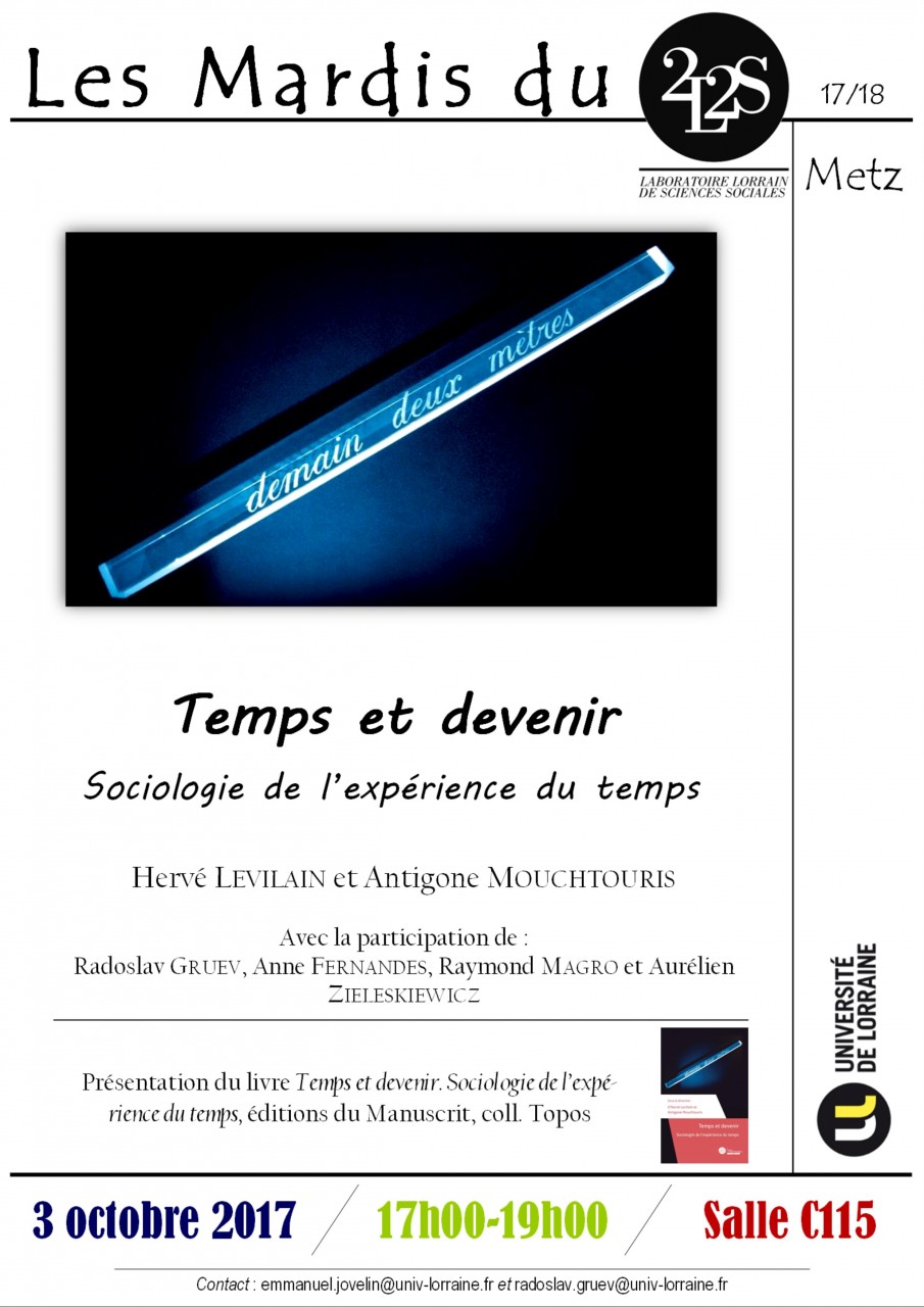 Elle portera sur la présnetation du livre "Temps et devenir. Sociologie de l'expérience du temps"paru aux éditions du Manuscrit, sous la direction d'Hervé Levilain et Antigone Mouchtouris.