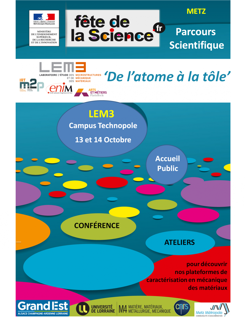 Dans le cadre de la fête de la science, deux rendez-vous avec les chercheurs du LEM3 (Laboratoire de Recherche en science des matériaux de l'Université de Lorraine - CNRS), en partenariat avec l'ENIM, l'IRT-M2P, les Arts et Métiers ParisTech :