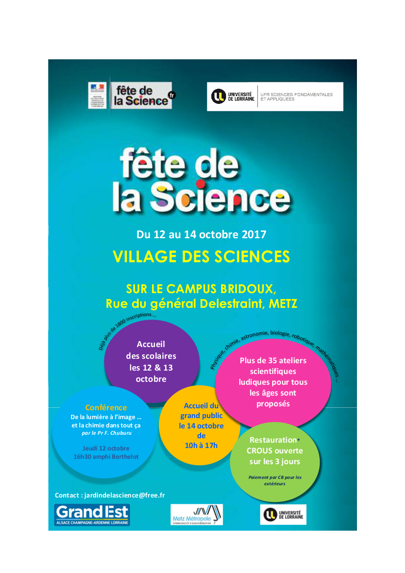 Organisée depuis plusieurs années à l’Université de Metz puis de Lorraine, le village des sciences regroupera cette année une moyenne de quarante stands scientifiques et techniques sur les 3 journées du 12 au 14 octobre 2017.