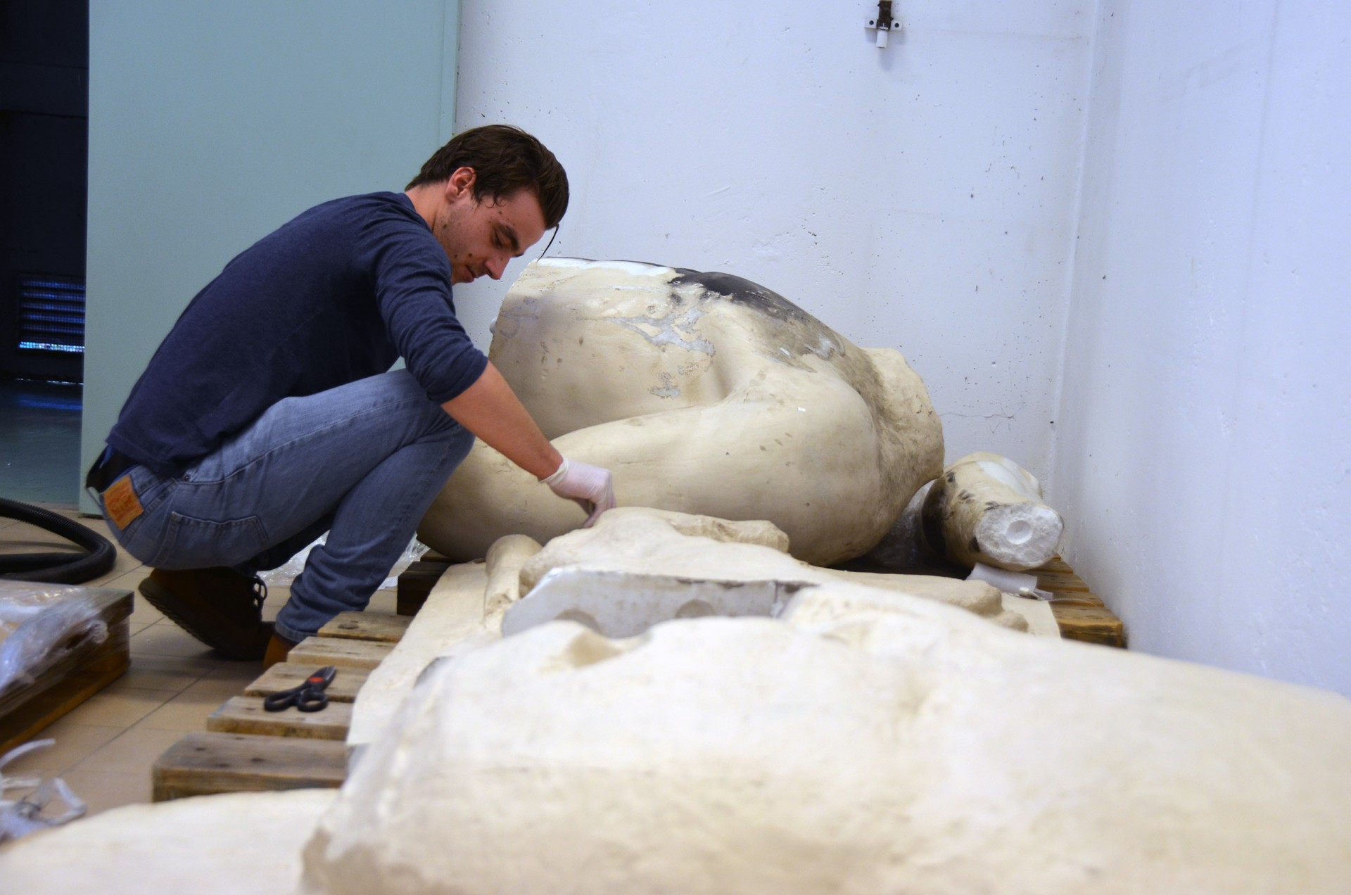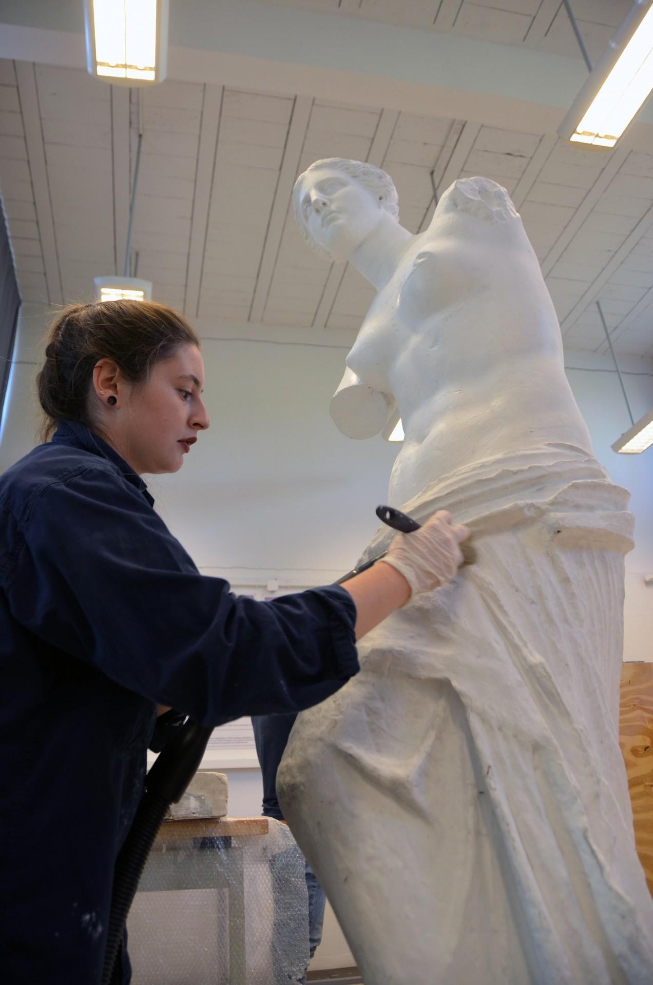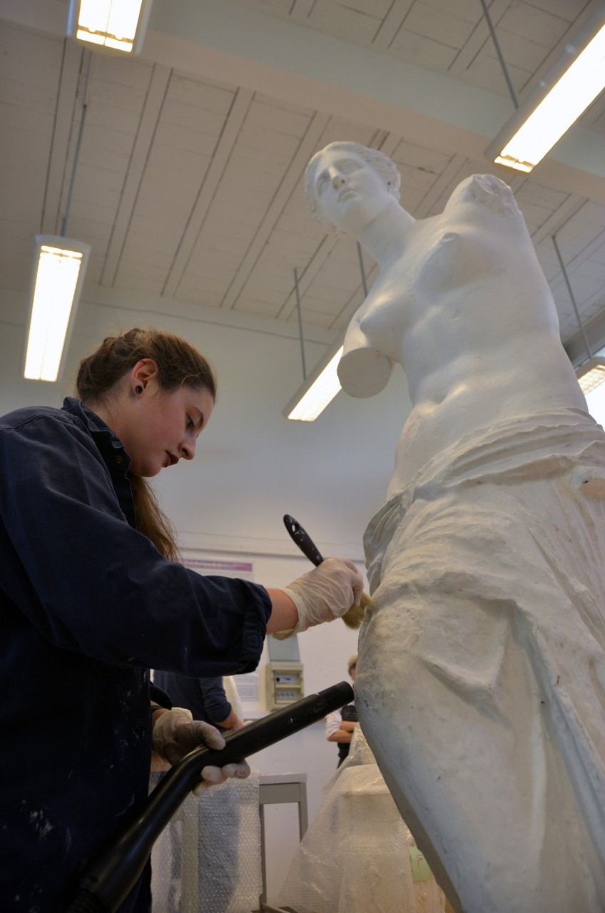 Nous sommes loin du Louvre, mais c’est bien la Vénus de Milo que Violette, étudiante en licence 3 d’histoire de l’art, est en train de dépoussiérer avec un petit pinceau et un aspirateur. Ou plutôt sa copie en plâtre, grandeur nature. Si elle n’était inscrite de tags et recouverte de plusieurs couches de peinture blanche, le profane se laisserait sans doute surprendre. « Après le dépoussiérage, je nettoierai la peinture avec une éponge très peu humide. Les produits et outils qu’on utilise dépendent du nombre de couches de peinture. »