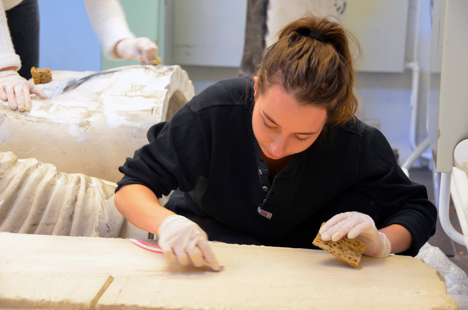 Anastasia, Amélie et Justine s’attaquent à des graffitis. Tâche difficile, puisqu’il ne faut pas abimer le plâtre. « Nos études sont assez théoriques. C’est agréable de pouvoir être en relation direct avec des objets et avec des gestes professionnels. »