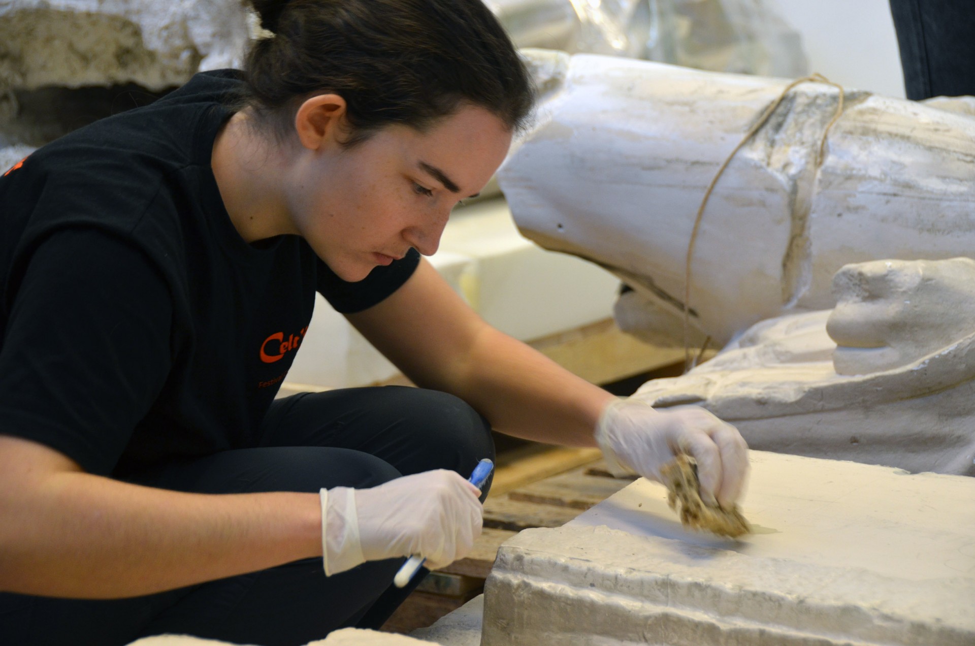 Dans une autre salle, Anxhelo, étudiant en master 1 d’archéologie, est concentré sur une caryatide de 2,20 mètres de haut, accompagné par Théo, en licence 2 d’histoire de l’art et archéologie, qui gère l’ambiance musicale. Albanais, c’est la cinquième année qu’il passe en France pour suivre ses études en archéologie. « J’aime bien le terrain. J’ai déjà participé à des missions de post-fouilles, où je nettoyais les outils… J’ai aussi restauré des photos pour un musée… Mais c’est la première fois que je fais de la restauration sur des statues. De toute façon, les techniques de restauration sont importantes, on les utilise aussi pendant les fouilles ».