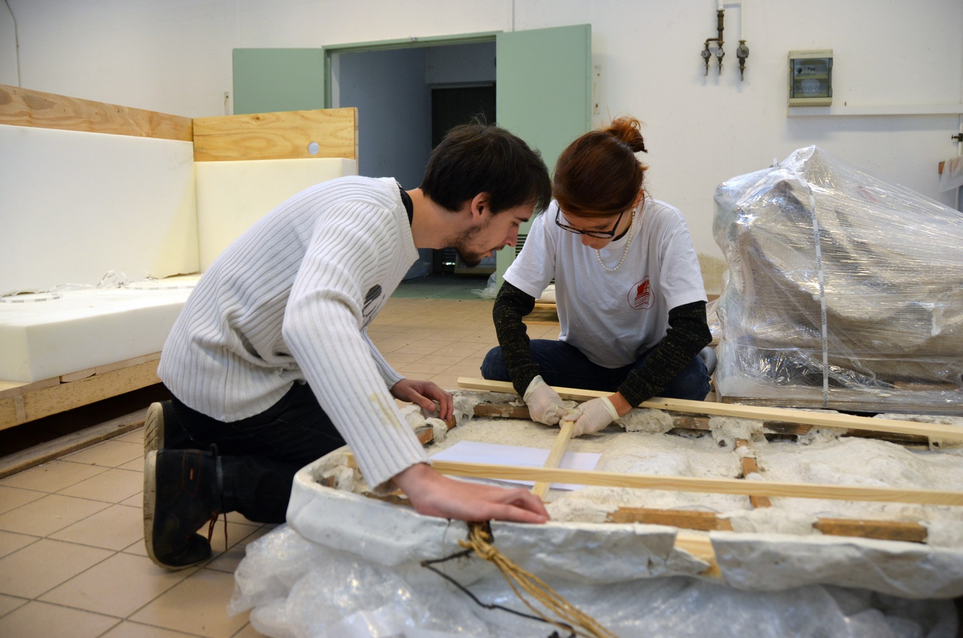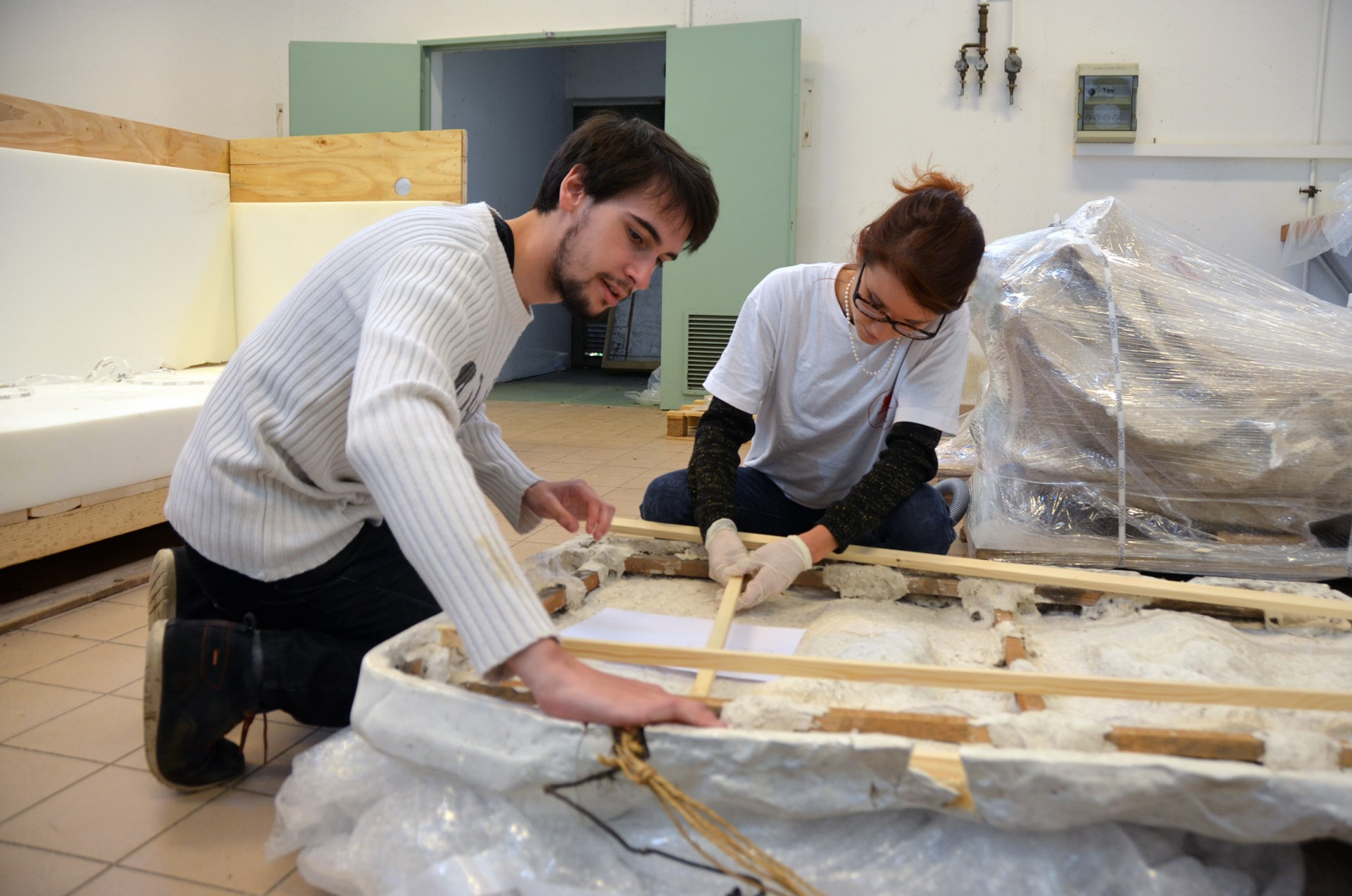 Manon, en licence d’archéologie, et Jordan, en histoire de l’art, s’attaquent à la consolidation d’un panneau représentant la naissance de Vénus. Le plâtre comportant des fissures, ils renforcent l’armature en bois qui le fonde. Tous deux participent au stage pour des raisons différentes. Jordan aimerait poursuivre des études dans la restauration statuaire et Manon est encore en recherche. C’est pour elle l’occasion de découvrir de nouvelles disciplines, de nouvelles voies et de sonder sa motivation.