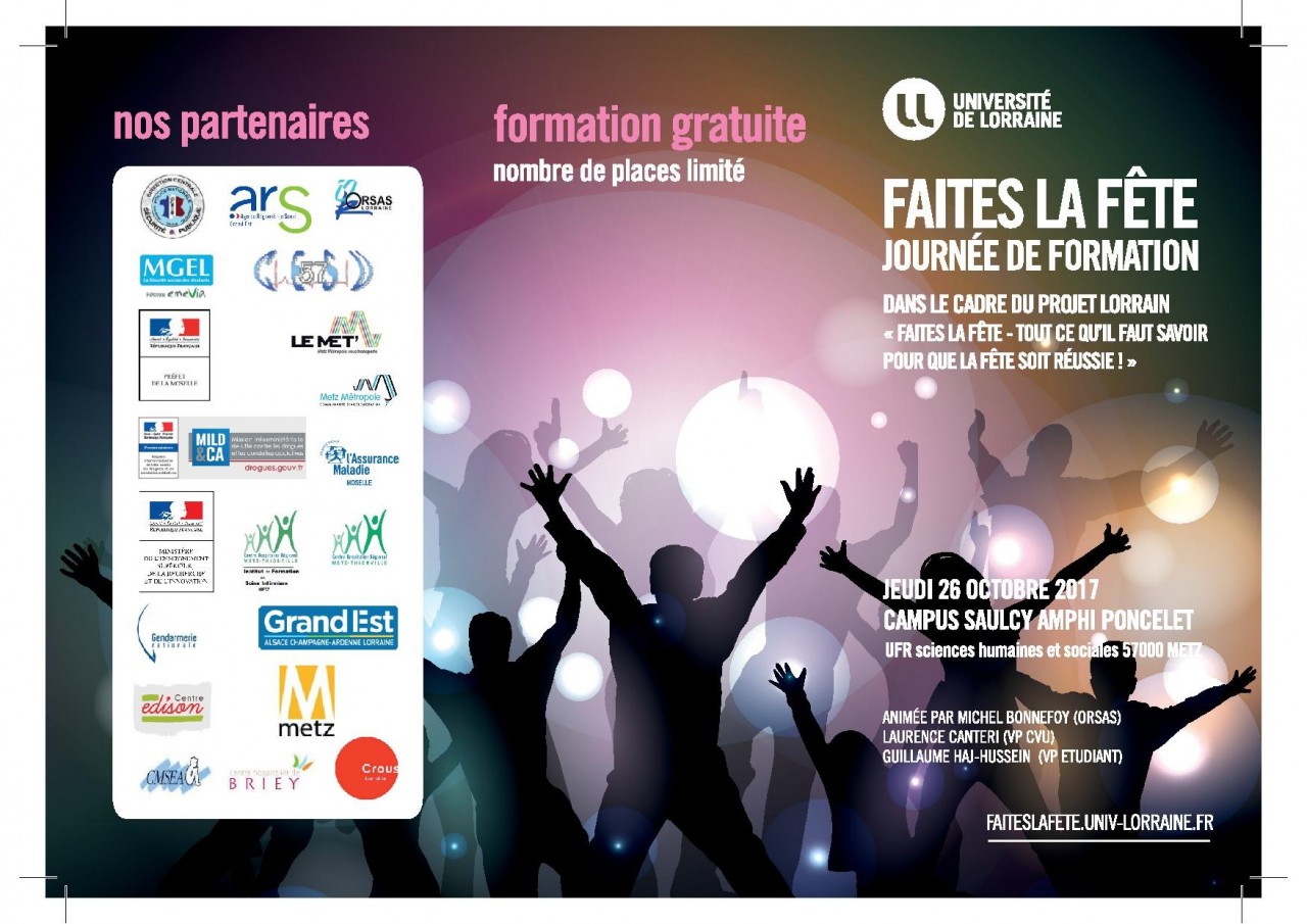 L'Université de Lorraine organise le jeudi 9 Novembre 2017, la 9e journée de formation « Faites la Fête » sur le campus ARTEM (Amphi 200) à Nancy. Une version identique se tiendra à Metz, le jeudi 26 octobre 2017, sur le campus Saulcy (amphi Poncelet). Organisée par le Service Universitaire de Médecine Préventive et de Promotion de la Santé (SUMPPS), cette journée de formation est destinée à tous les étudiants Lorrains qui organisent des soirées et manifestations festives (étudiants responsables d’associations, de foyers, des bureaux des élèves et cercles étudiants, etc.).