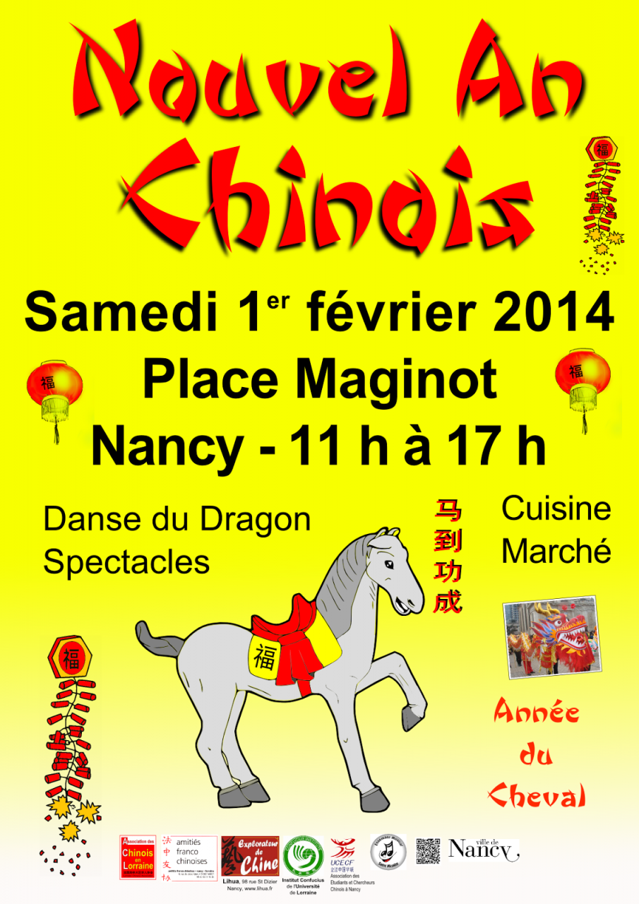 L'Institut Confucius vous souhaite une très bonne année du cheval et vous convie à la manifestation festive qui aura lieu le 1er février à Nancy : danse du dragon, spectacles, cuisine et marché chinois sont au programme.