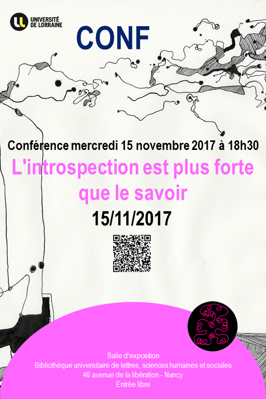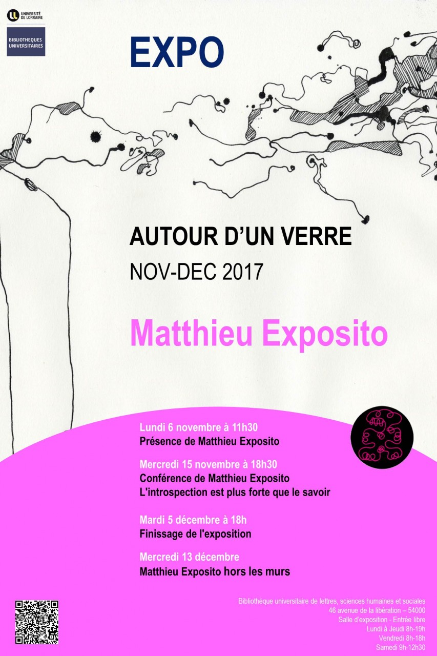 Matthieu Exposito animera une conférence L'introspection est plus forte que le savoir le mercredi 15 novembre à partir de 14h dans la salle d'exposition de la Bibliothèque universitaire de lettres, sciences humaines et sociales - 46 avenue de la libération - Nancy. Entrée libre. La communication se déroulera en 3 phases : La naissance de l'artiste, La projection d'une vidéo, La prise de conscience du statut d'artiste. Le déroulé de l'exposé permettra d'avoir un bel aperçu de l'évolution des œuvres de Matthieu Exposito et du monde des galeristes. L'artiste est riche de 120 expositions à son actif dans des lieux extrêmement variés et à découvrir lors de cette fi d'après midi conférence/débat.
