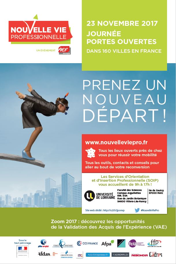 Dans le cadre de la journée nationale sur la transition professionnelle, l'Université de Lorraine accueillera sur les 2 sites du Service d'Orientation et d'Insertion Professionnelle, de 9h à 17h non stop, le public adulte en réflexion sur son avenir professionnel à la recherche d'informations sur les dispositifs d'aide au financement, les types de formation ouvertes, ...