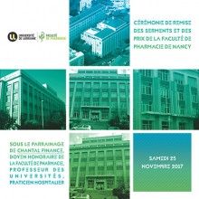 La Faculté de Pharmacie remettra, lors d'une cérémonie, les prix aux étudiantes et étudiants les plus méritants ainsi que le serment des apothicaires à la promotion de 6e année 2016 - 2017 sous le parrainage de Mme Chantal Finance, Doyen Honoraire de la Faculté de Pharmacie, Professeur des Universités-Praticien-Hospitalier.