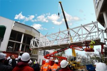 Isaac Newton disait : « Les hommes construisent trop de murs et pas assez de ponts. », et bien à l’Université de Lorraine, lorsque l’on construit des murs, on construit aussi des ponts. Les personnels des facultés de médecine, odontologie et pharmacie étaient invités ce mercredi 8 novembre à assister à la pose de la passerelle qui relie les deux ailes du nouveau bâtiment en cours de construction sur le campus Biologie-Santé à Nancy.