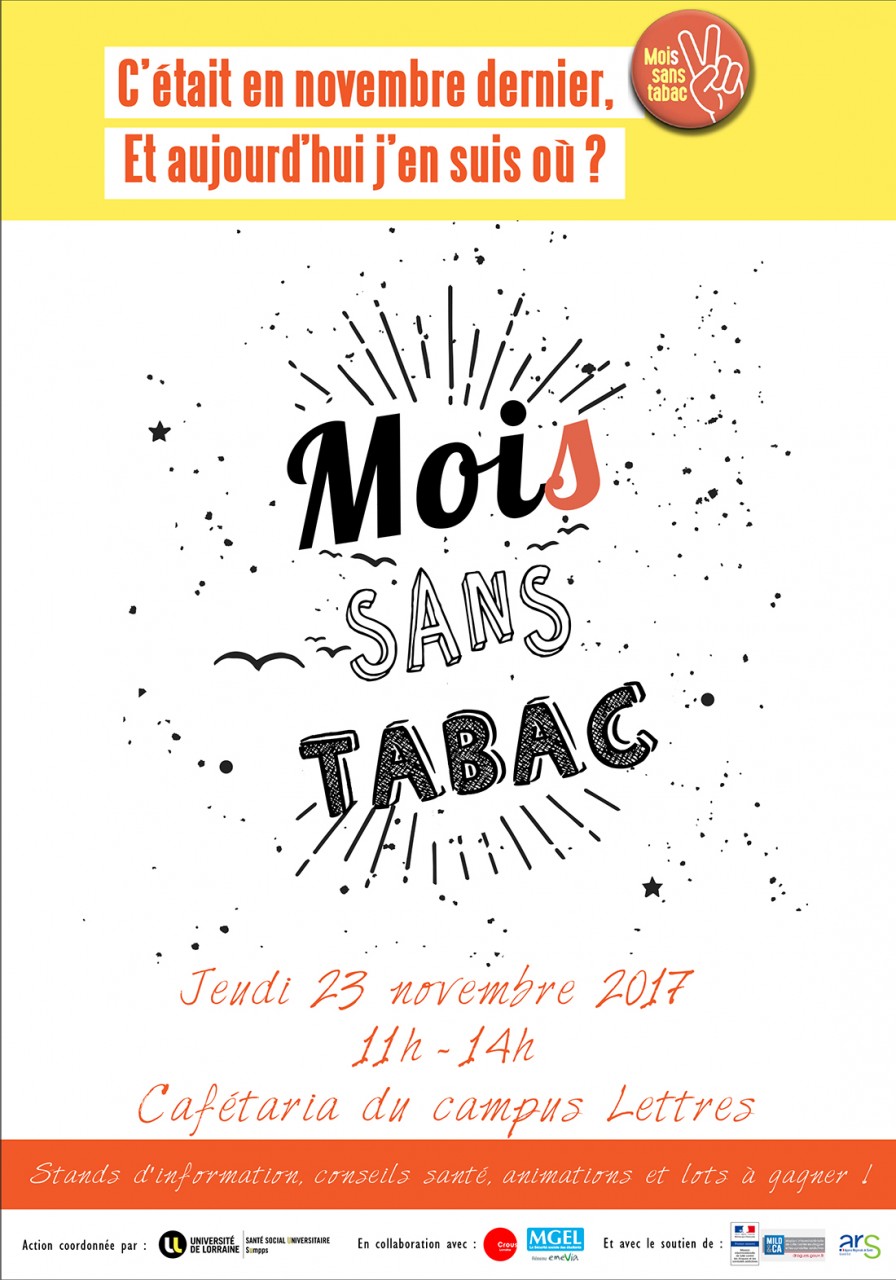 Le Service Santé Social (SUMPPS) Etudiants Lorraine Sud de l’Université de Lorraine, en partenariat avec le CROUS et la MGEL, et avec le soutien de la MILDECA et de l’ARS Grand Est, organise une « Journée sans tabac » le jeudi 23 novembre 2017, dans le cadre du « Moi(s) sans tabac ».
