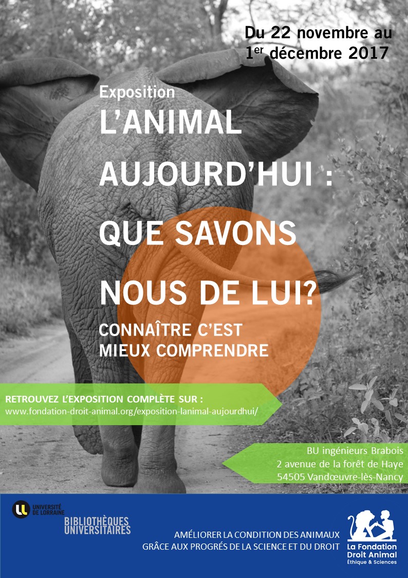 Cette exposition est présentée par la Fondation droit animal, éthique et sciences (LFDA) à l’occasion de ses 40 années d’existence, à la BU ingénieurs Brabois du lundi au vendredi de 8h à 19h.