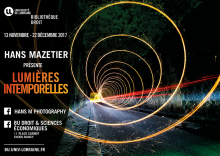 La Bibliothèque Universitaire de Droit et Sciences économiques accueille un ensemble de photographies de Hans M. Photography. L'exposition se déroule du 13 novembre au 22 décembre 2017. L'artiste en quelques mots !Photographe amateur, Hans Mazetier est passionné par la prise de photographie nocturne et pratique la pose longue en milieu naturel ou urbain. Intrigué par les ambiances que revêtent la nuit nos environnements quotidiens, il cherche à fixer le temps et la lumière, en valorisant les lieux et le patrimoine de Lorraine. Le fait de peindre tout cet environnement avec de la lumière, d'apporter un éclairage différent, coloré, constitue le socle d'une recherche artistique qui évolue avec le temps.