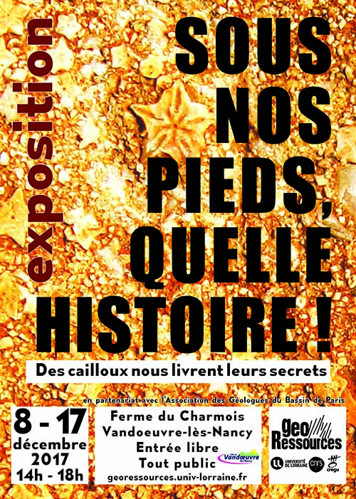 Le laboratoire de recherche GeoRessources (Université de Lorraine, CNRS, CREGU), en collaboration avec l'Association des Géologues du Bassin de Paris, a le plaisir de vous inviter à l'exposition intitulée "Sous nos pieds, quelle histoire !", organisée à la Ferme du Charmois de Vandoeuvre-lès-Nancy du 8 au 17 décembre.