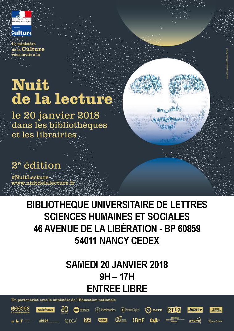 Pour sa deuxième édition, la Nuit de la lecture se déroulera le samedi 20 janvier 2018 dans les bibliothèques et librairies qui proposent plusieurs milliers d'événements partout en France. Toute la journée du samedi 20 janvier 2018 de 9h à 17h à la bibliothèque universitaire de lettres, sciences humaines et sociales de Nancy, vous êtes invités à venir découvrir des auteurs, des lectures, un atelier d'écriture, une troupe d'improvisation, un moment musical, des conférences, des artistes, un éditeur, une exposition. Romans, bandes dessinées, ouvrages scientifiques, nouvelles, contes, science fiction, poésie et cinéma seront les principaux thèmes de cette journée.