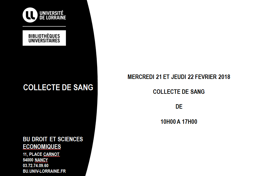 La Bibliothèque Universitaire de Droit et Sciences économiques accueille les 21 et 22 février 2018 de 10h00 à 17h00 une collecte de sang.