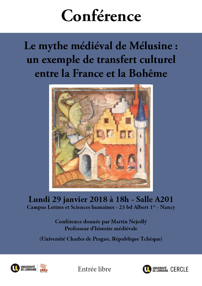 Lundi 29 janvier 2018, à 18h, sur le campus LSHS, en salle A201, Martin Nejedlý, médiéviste tchèque et professeur à l'Université Charles de Prague, spécialiste de l'histoire des systèmes symboliques et l'anthropologie historique, donnera une conférence sur le mythe médiéval de Mélusine, abordé ici comme vecteur de transferts culturels entre la France et la Bohême. La conférence est organisée par le CRULH et le CERCLE.