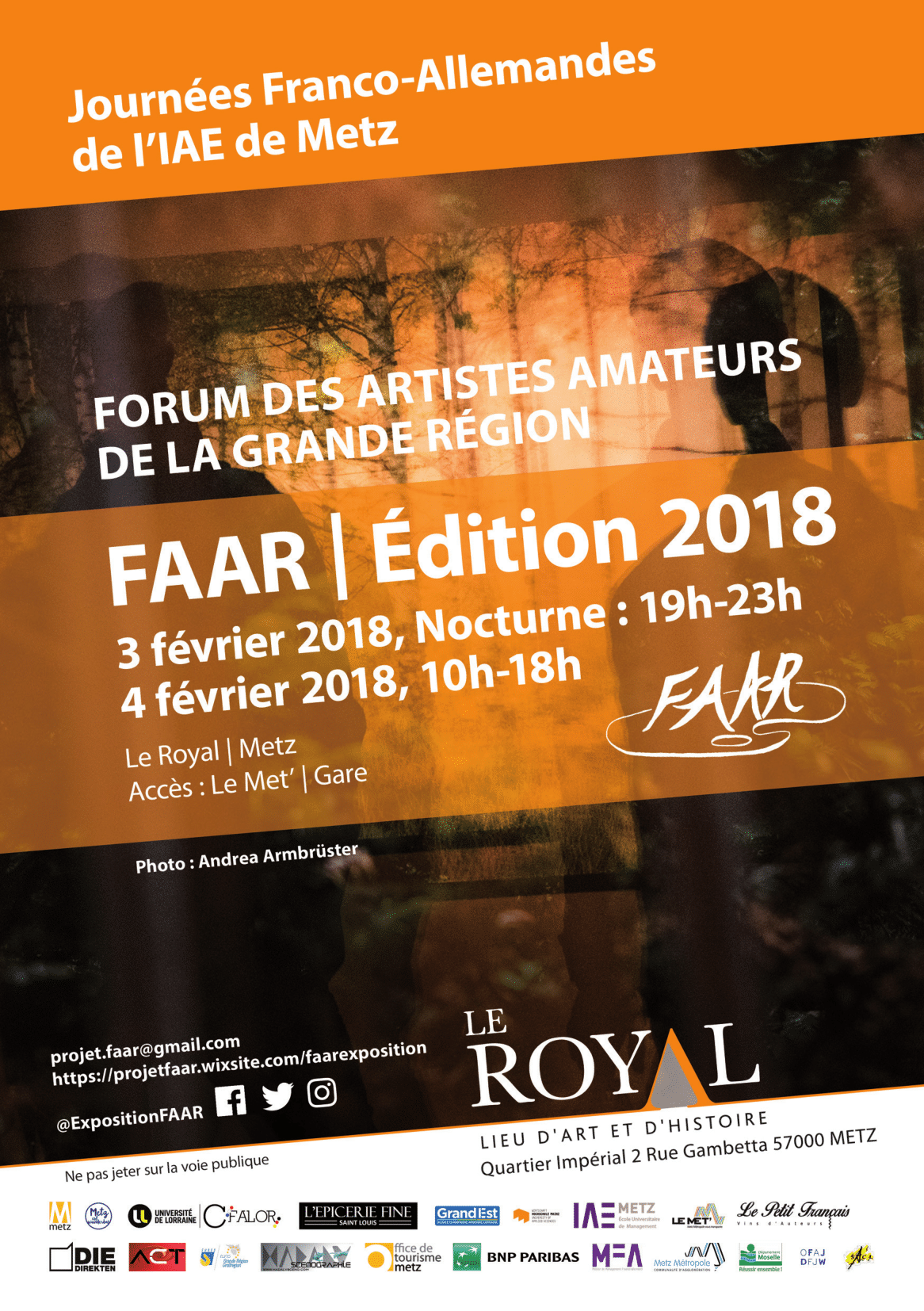 Le Forum des Artistes Amateurs de la Grande-Région (FAAR) se renouvelle pour la 12ème année consécutive et se tiendra les 3 et 4 février prochains au Royal à Metz, dans le cadre des Journées Franco-Allemandes organisées par l’Association Management Franco-Allemand. Cette 12ème édition marque un tournant par l’introduction d’un nouveau concept et un nouveau lieu de réception.
