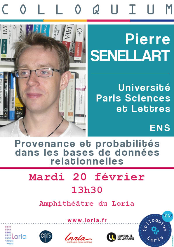 Le colloquium du Loria se poursuit en 2018 avec l'exposé de Pierre Senellart, le mardi 20 février à 13h30 dans l’amphithéâtre du laboratoire Loria. Pierre Senellart est professeur en informatique à l’ENS (Université Paris Sciences et Lettres) au sein du laboratoire DI de l’ENS. Son exposé s’intitule “Provenance et probabilités dans les bases de données relationnelles”. Voici le résumé de sa présentation : Nous passons en revue les bases de la notion de provenance des données dans les bases de données relationnelles. Nous décrivons différents formalismes de provenance, de la provenance booléenne à la provenance par semi-anneaux et au-delà, qui peuvent être utilisés pour une large variété de buts, afin d'obtenir de l'information supplémentaire sur le résultat d'une requête. Nous discutons des systèmes de représentation pour la provenance des données, les circuits en particulier, en insistant sur les aspects d'implémentation. Enfin, nous expliquons comment la provenance est utilisée en pratique pour l'évaluation de requêtes dans les bases de données probabilistes. Les personnes extérieures au laboratoire doivent s'inscrire par e-mail avant le vendredi 16 février.
