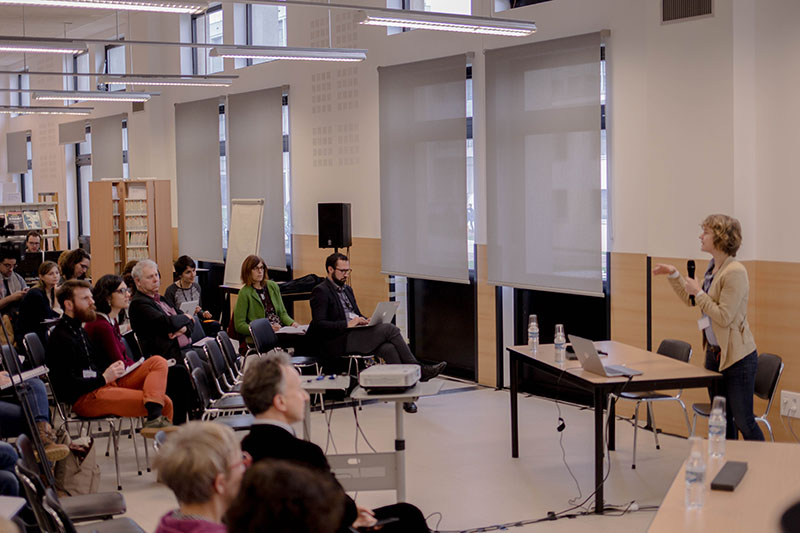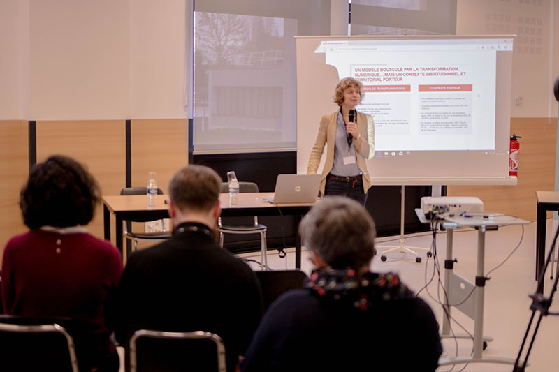 Laëtitia Stagnara nous a présenté le projet de transformation de la bibliothèque de la Cité des Sciences. Elle a insisté sur la nécessité de se positionner dans une dynamique d’évolution au sein même du bâtiment, de la signalétique à l’accueil, en passant par la formation des personnels aux outils numériques. Il s’agit de démontrer que la bibliothèque n’est pas une institution figée mais bien un lieu d’échange, modulable selon ses intérêts et capable de nous conduire vers la découverte, scientifique ou artistique.