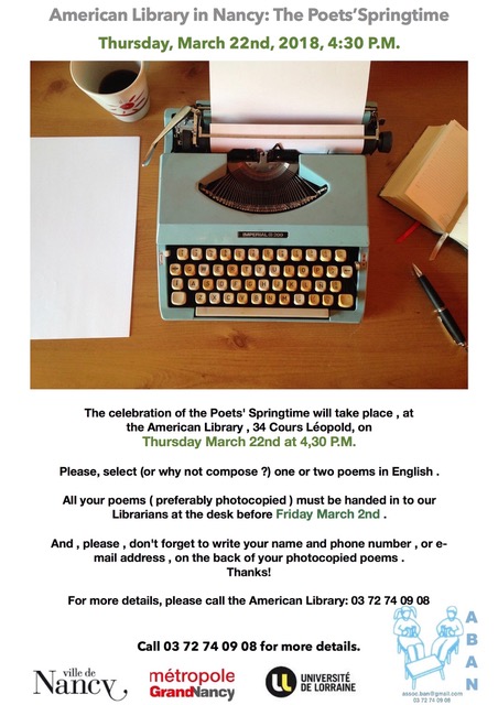 L'association des Amis de la Bibliothèque Américaine vous propose de venir célébrer le Printemps des Poètes mardi 22 mars 2018 à 16h30 à la Bibliothèque Américaine de Nancy.