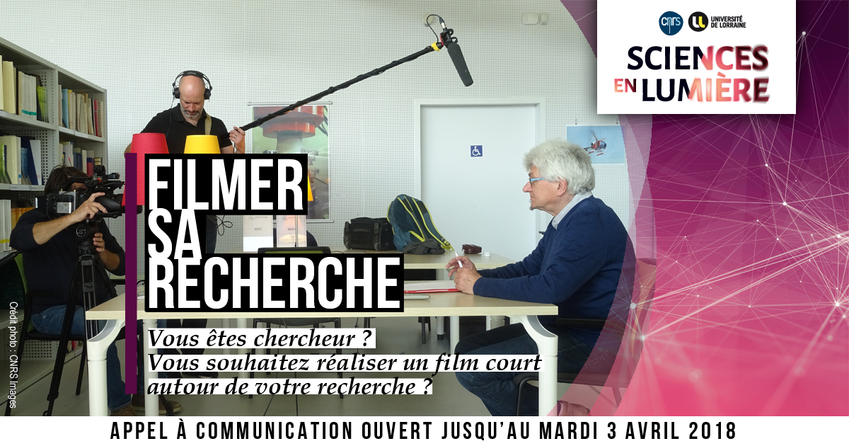 Inscrivez-vous au Concours FILMER SA RECHERCHE Le concours « Filmer sa recherche » organisé par Sciences en Lumière vous offre la possibilité de présenter un projet de film à partir de votre recherche. Après étude des dossiers déposés par un jury de chercheur.e.s et de professionnel.le.s de l’image, dix projets maximum seront sélectionnés. Les candidat.e.s retenu.e.s seront auditionné(e)s le jeudi 7 juin 2018, à Vandœuvre-lès-Nancy (présence physique obligatoire). Les prix seront remis le vendredi 8 juin à Vandœuvre-lès-Nancy. Deux prix seront attribués : - Le « Prix CNRS Images » : La communication retenue fera l’objet d’un film court, faisant état d’une recherche en cours, réalisé et produit par CNRS Images. Le ou la lauréat(e), en tant qu’auteur(e) scientifique ou coauteur(e) présentera sa recherche à l’équipe de réalisation qui en assurera le suivi, la production et la réalisation. Le ou la lauréat(e) chercheur(e) se tiendra disponible pour l’équipe de réalisation et validera le contenu scientifique. (tous les projets seront étudiés mais CNRS Images ne prendra pas en charge les frais de tournage hors France Métropolitaine.) - Le « Prix Sciences en Lumière » : Aide à la production de 3 000 euros (trois mille euros) destinée à permettre le développement du projet primé à travers un scénario, de préparer une production et de collecter de la matière visuelle pour étayer le dossier, ou d’obtenir une aide au montage. Inscription et règlement sur www.sciencesenlumiere.fr Pour consulter le règlement du concours Pour vous inscrire, formulaire en ligne