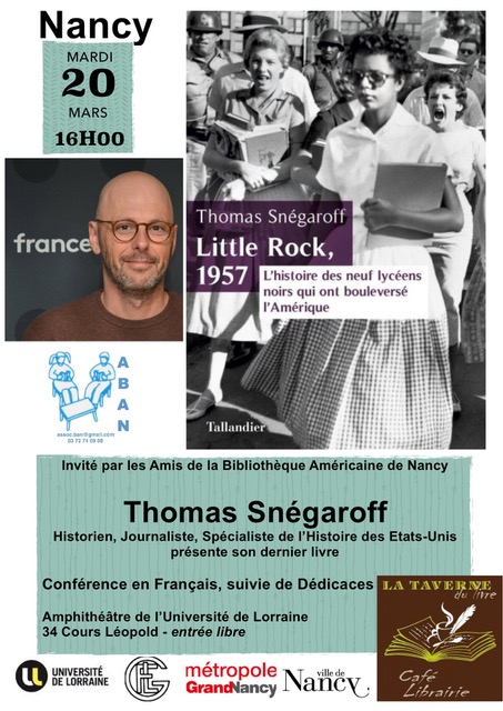 Les Amis de la Bibliothèque Américaine vous invite à une conférence de Thomas Snégaroff, historien, journaliste et spécialiste des Etats-Unis. Il parlera de la thématique de son dernier ouvrage à savoir l'histoire des "neuf de Little Rock", neuf lycéens noirs qui ont osé s'opposer à la ségrégration raciale de leur pays !