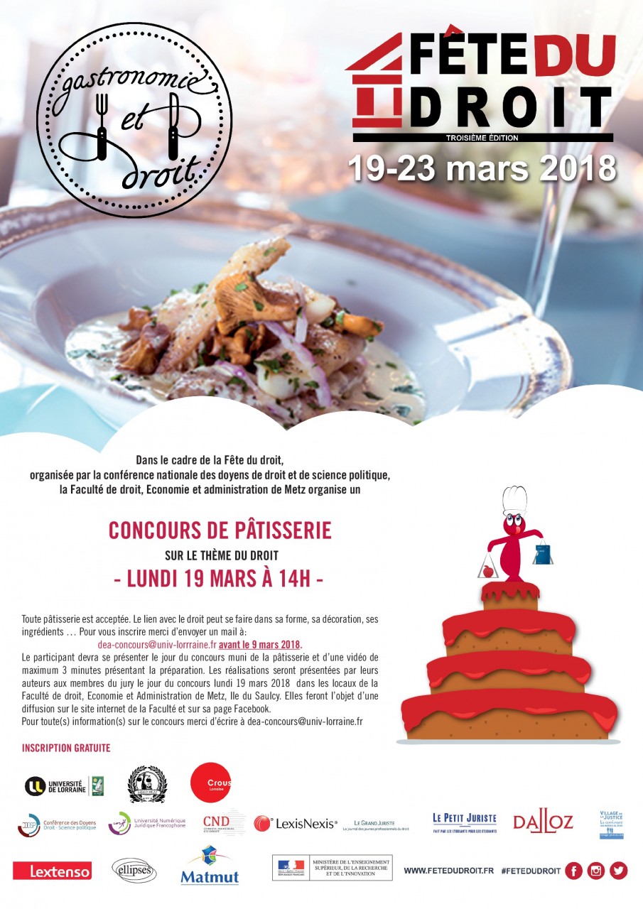 Dans le cadre de la Fête du droit, organisée par la conférence nationale des doyens de droit et de science politique, la Faculté de droit, Economie et administration de Metz organise un CONCOURS DE PÂTISSERIE sur le thème du droit lundi 19 mars à 14h. Toute pâtisserie est acceptée. Le lien avec le droit peut se faire dans sa forme, sa décoration, ses ingrédients …