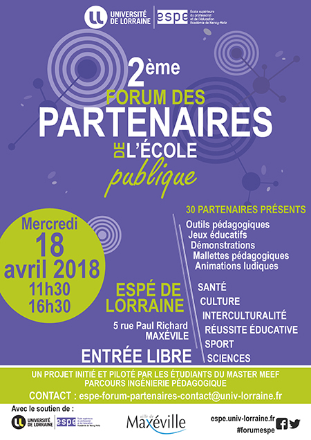 Après une 1ère édition sur le site de Nancy-Maxéville, puis une 1ère édition sur le site de Bar-le-Duc, la prochaine édition du "Forum des Partenaires de l’École Publique" de l'ESPE de Lorraine se déroulera à Maxéville le mercredi 18 avril 2018, de 11h30 à 16h30.