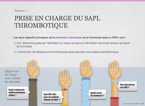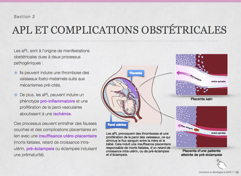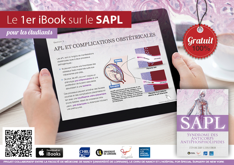 Ce syndrome est complexe à appréhender pour les étudiants en médecine comme pour les médecins non spécialistes de pathologie vasculaire et auto-immune. Par conséquent, l’idée a germé de créer un livre interactif (iBook) sur ce sujet en se servant de l’interactivité possible grâce à la plateforme Apple pour faciliter l’enseignement de ce syndrome. Ce premier livre interactif sur le SAPL est le fruit d’un travail collaboratif qui s’est étalé sur une année entre la faculté de médecine (Laurent Phialy et Pr Stéphane Zuily) et l'Hospital For Special Surgery de New York (Dr Doruk Erkan, responsable du groupe international APS ACTION dédié au SAPL). Il a été présenté pour la première fois lors du congrès international organisé à Chypre en 2016 (www.apsistanbul2016.org) puis lors du forum européen organisé à la faculté de médecine de Nancy en avril 2017 (www.apsnancy.com).