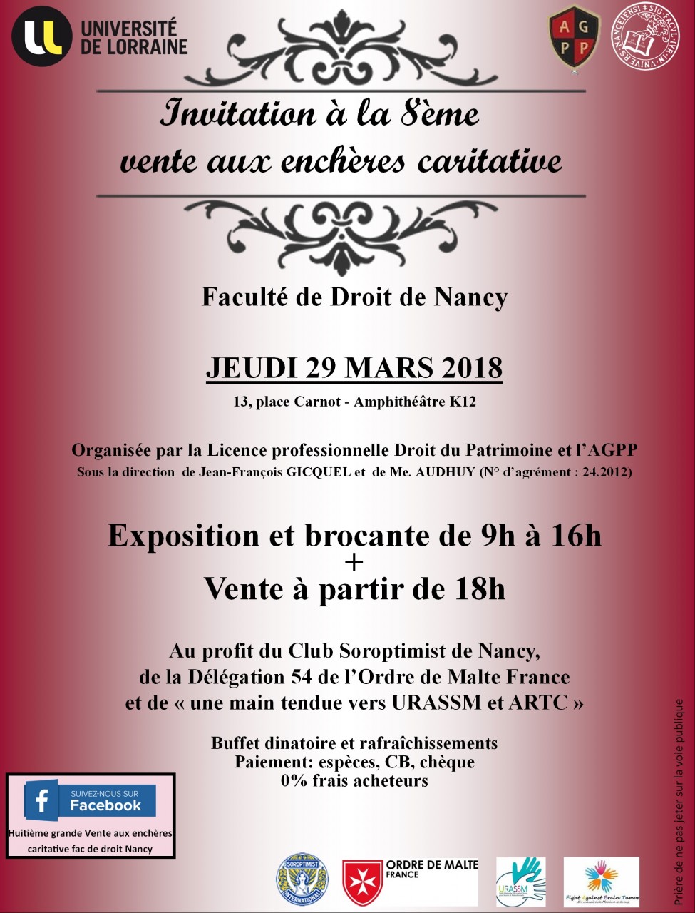 M. Jean-François Gicquel, MCF-HDR à l'Université de Lorraine, et les étudiants de la Licence Professionnelle Droit du Patrimoine vous convient le jeudi 29 mars 2018 à la huitième grande vente aux enchères caritative de la Faculté, organisée comme chaque année dans le but de remettre à titre principal, desbourses au mérite à des étudiants, et à titre accessoire, des subventions à des associations caritatives, et qui se déroulera comme suit :