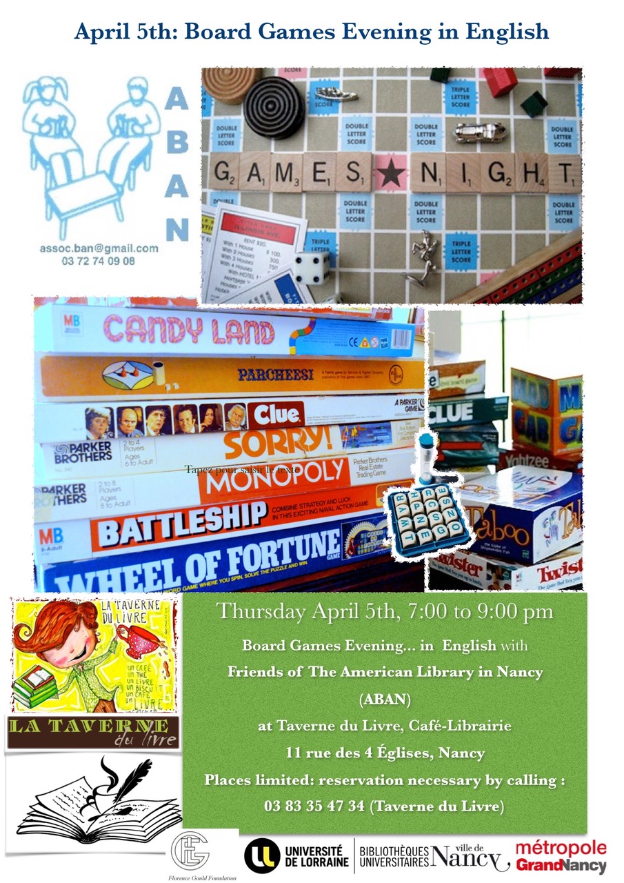 L'association ABAN (Amis de la Bibliothèque Américaine) organise une soirée de jeux de société en anglais jeudi 05 avril 2018 de 19:00 à 21:00.