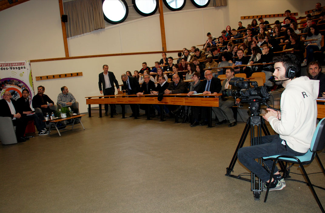 Ludovic Bisilliat et Nicolas Bredart tous deux journalistes à Vosges télévision, animaient conjointement l’évènement à l’IUT d’Epinal et à Saint-Dié.