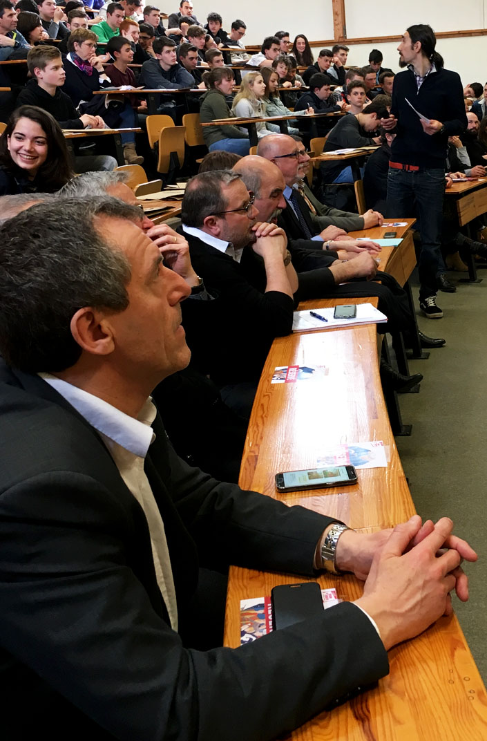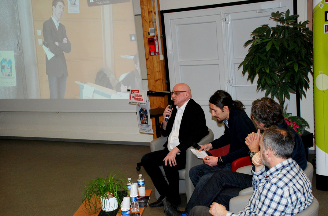 Les deux séances ont débuté en même temps par le visionnage d’un film découverte de chaque entreprise (Moustachebikes, Pavatex, Numalliance, Vdindustrie, WM 88, Salveco) réalisé par des étudiants des IUT. Un représentant de chaque entreprise en présentait l'activité et les métiers.