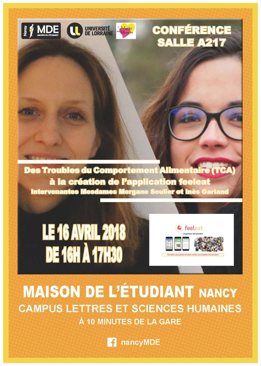 Morgane Soulier fondatrice de l’application Feeleat et Inès Garland présidente de l’association Solidarité Anorexie Boulimie 54 vous invitent à suivre leur conférence le lundi 16 avril 2018 de 16h à 17h30, celle-ci se déroulera sur le Campus Lettres et Sciences Humaines Nancy en salle A217.