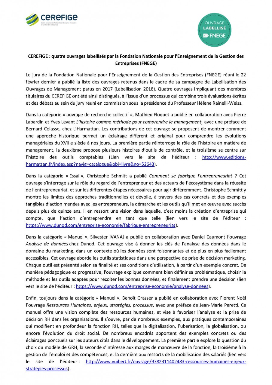 Le jury de la Fondation Nationale pour l’Enseignement de la Gestion des Entreprises (FNEGE) réuni le 22 février dernier a publié la liste des ouvrages retenus dans le cadre de sa campagne de Labellisation des Ouvrages de Management parus en 2017 (Labellisation 2018). Quatre ouvrages impliquant des membres titulaires du CEREFIGE ont été ainsi distingués, à l’issue d’un processus qui combine trois évaluations écrites et des débats au sein du jury réuni en commission sous la présidence du Professeur Hélène Rainelli-Weiss.