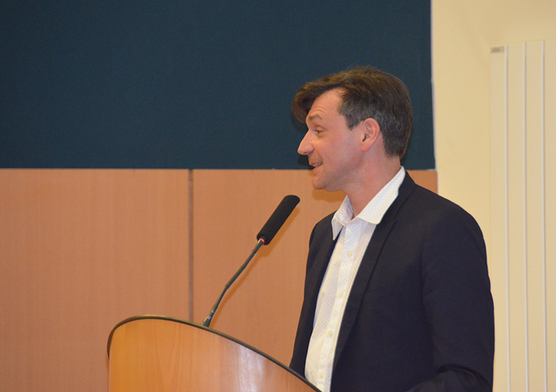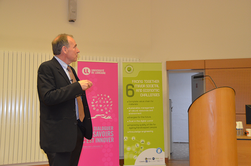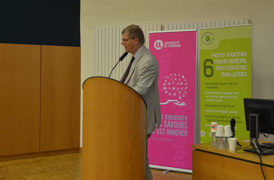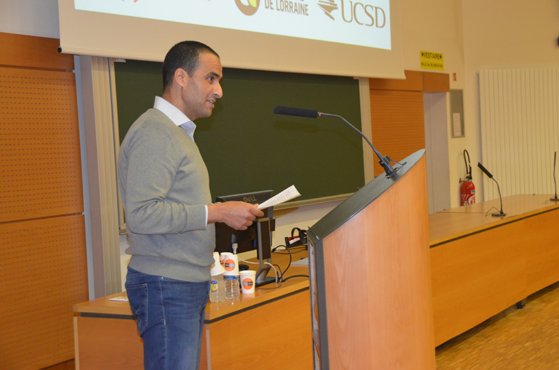 Stéphane Mangin, enseignant-chercheur et responsable de l'équipe Nanomagnétisme et électronique de spin de l'IJL et proche collaborateur d’Eric Fullerton, a présenté le chercheur américain. Karl Tombre, vice-président Stratégie européenne et internationale de l’Université de Lorraine et directeur exécutif de Lorraine Université d’Excellence, et Badreddine Assouar, directeur adjoint de l’IJL en charge des relations internationales, l’ont ensuite accueilli à la tribune.