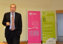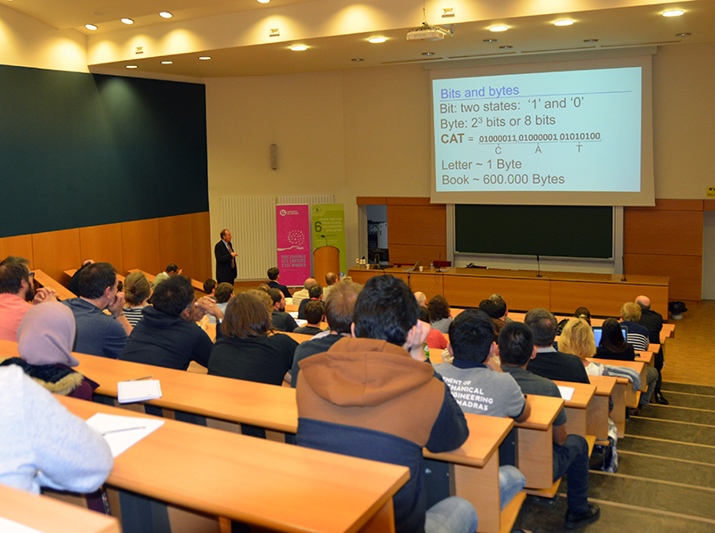 Spécialiste du magnétisme et des nanostructures magnétiques, Eric Fullerton a présenté un état de l’art sur le stockage des données et su les défis à relever dans le futur, avec pédagogie et humour. Le chercheur remarque d’abord que le nombre de données augmente exponentiellement, dans un monde numérique où chacun d’entre nous est producteur de données. Ainsi, la quantité de données double tous les 2 ans. Si nous anticipons sur l’internet des objets, la quantité de données à stocker devient un problème, tant en termes de technologies actuelles que de consommation d’énergie, et donc d’économie. La recherche s'oriente donc vers une nouvelle génération des moyens de stockage des données issue de la recherche en nanotechnologies, s'inspirant du fonctionnement neuronal du cerveau humain.