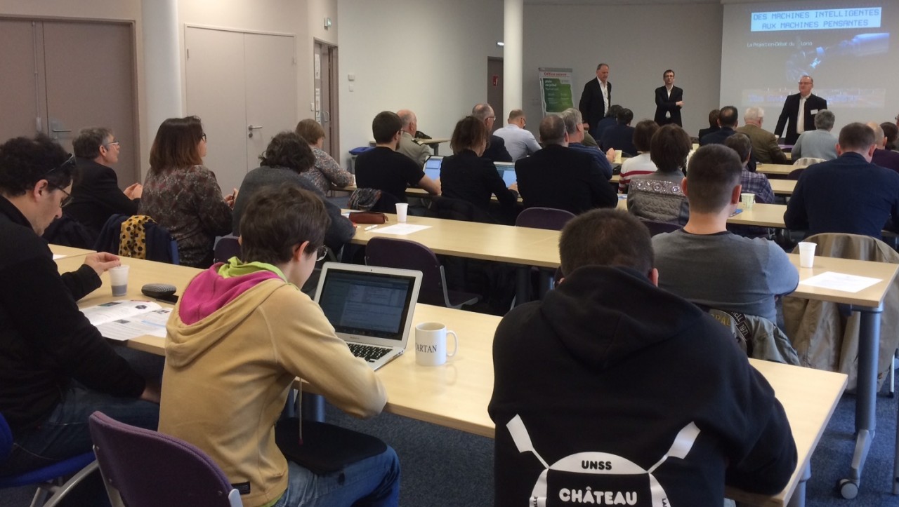 - L'intelligence artificielle : le lien entre l’Homme et les machines - les robots à travers le cinéma : 2 enseignants-chercheurs du LORIA, M. DUTECH et M. DUPUY DE LA CELLULE, ont initié cette journée en s'appuyant de films de science-fiction pour positionner la place de l’intelligence artificielle dans l’imaginaire, puis dans sa concrétisation. De 1957 à 2005 les extraits ont souligné les constantes de questionnement et des approches. Avec méthode, les enseignants ont démontré le postulat récurrent utilisé dans tous ces films américains, à savoir que l'IA sera toujours plus forte que nous et que les extra-terrestres seront toujours des ennemis. En fait il faut plutôt comprendre que cette posture renvoie à l'agressivité de l'humanité dans ses rapports avec la Nature et entre ses membres. Les 2 enseignants ont poursuivi en démontrant avec brio qu’il y avait encore beaucoup d'erreurs dans les algorithmes et dans les résultats de l'IA aujourd'hui. Ce qui démontre que la primauté de l’Homme sur la machine demeure et demeurera une réalité encore intangible. Toute cette présentation s’est faite dans une interactivité permanente avec les participants … qu’il a bien fallu canaliser pour laisser l’intervenant suivant intervenir.