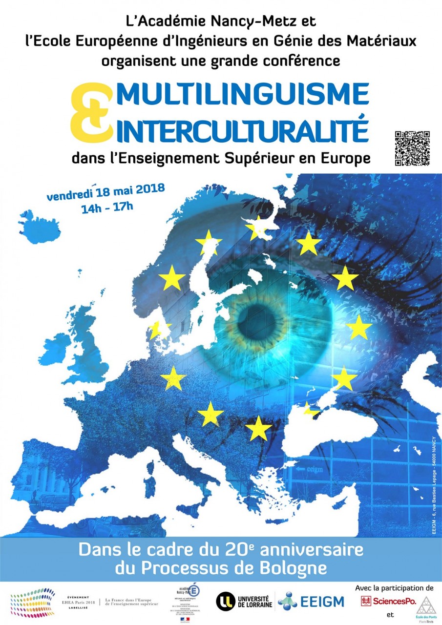 Dans le cadre du 20ème anniversaire du Processus de Bologne, l’Ecole Européenne d'Ingénieurs en Génie des Matériaux (EEIGM) et l’Académie de Nancy-Metz organisent le 18 mai 2018, une conférence/rencontre sur le thème « Multilinguisme et Interculturalité dans l’Enseignement Supérieur en Europe» qui a reçu le label du Ministère de l’Enseignement Supérieur, de l'Innovation et de la Recherche.