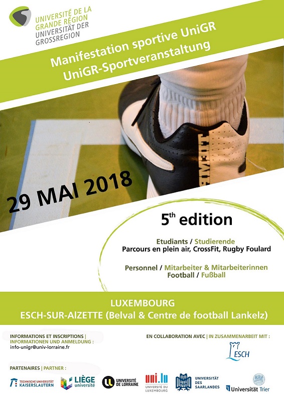 L'Université de la Grande Région - UniGR organise le 29 mai 2018 à Esch-sur-Alzette (Luxembourg) la 5ème édition de la journée culturelle et sportive inter-université des universités partenaires uniGR et recherche des participants pour former 2 équipes : une équipe d'étudiants et une équipe des membres du personnel.