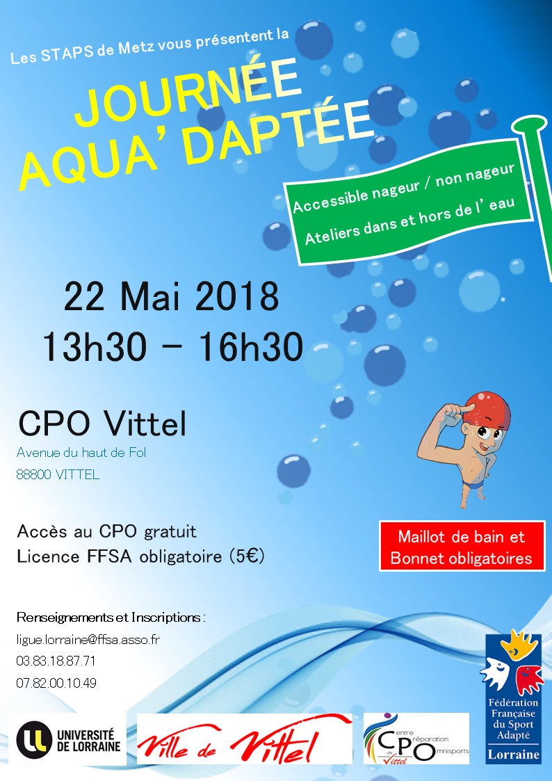 Les étudiants de la licence "Activité Physique Adaptée - Santé" (APA-S) du département STAPS de Metz en partenariat avec la Ligue Lorraine du Sport Adapté (LLSA) et le CPO de Vittel organisent une après-midi "Aqua’Adaptée" CPO de Vittel le Mardi 22 Mai de 13h30 à 17h à destination de public présentant différents handicaps ou troubles mentaux.