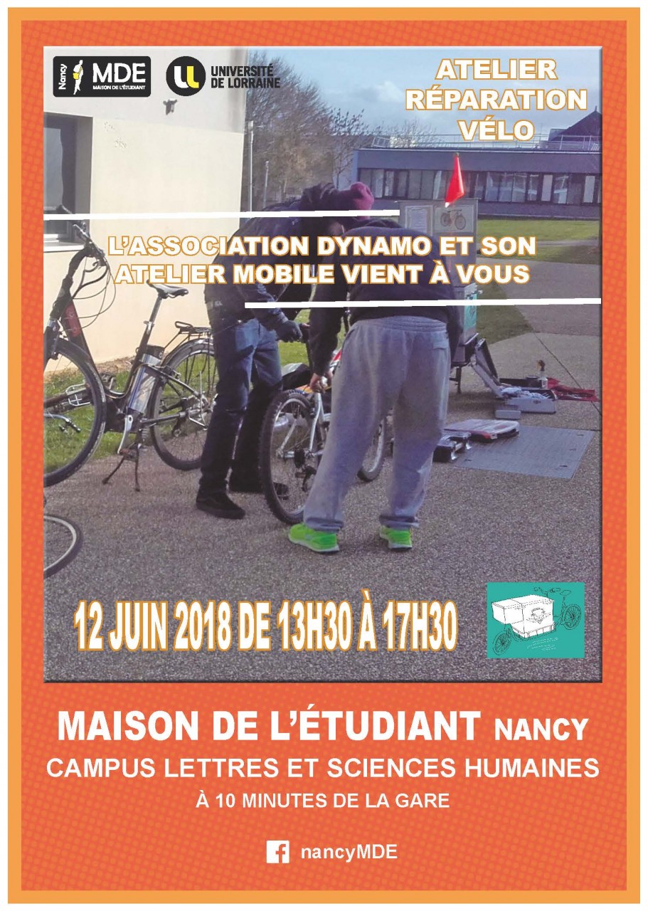 Le deuxième atelier de réparation de vélo aura lieu le 12 juin il est ouvert aussi bien aux étudiants qu'aux personnels. L'association Dynamo, avec ses bénévoles, vous conseillera et vous fournira des pièces de rechange à un prix raisonnable si besoin est, pour redonner une nouvelle jeunesse à votre bicyclette.