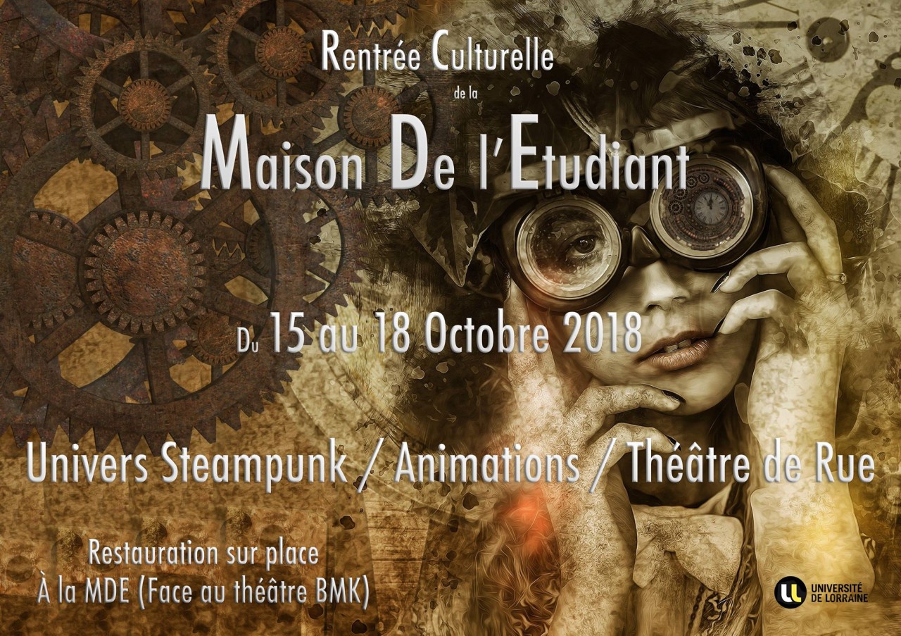 Pour sa rentrée culturelle 2018, la MDE de Metz organise une semaine associative sur le thème « Steampunk », le genre rétro-futuriste cher à Jules Verne. Chaque jour, des associations seront mises à l’honneur, dans la MDE, décorée pour l’occasion par des étudiants en arts plastiques.