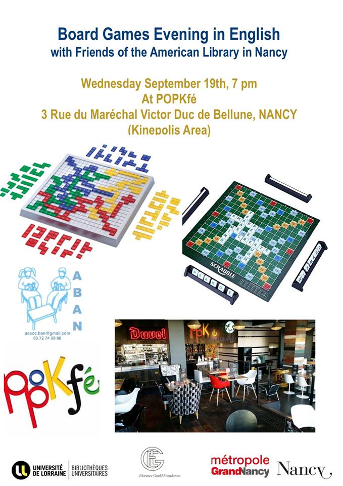 L'association ABAN (Amis de la Bibliothèque Américaine) organise une soirée de jeux de société en anglais mercredi 19 septembre 2018 de 19h00 à 22h00.