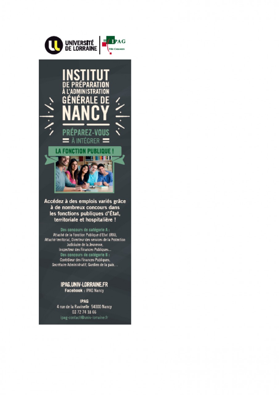 - La préparation externe de l'IPAG de Nancy est ouverte à tous et vous prépare aux concours administratifs de catégorie A, voire B dans le cadre d'une formation intensive accessible avec un niveau Licence III. Enseignants-chercheurs et professionnels de l'administration vous préparent par des enseignements méthodologiques et fondamentaux ainsi que par des galops d'essais réguliers. Enfin vous bénéficiez d'une préparation personnalisée et individuelle aux oraux en cas d'admissibilité à un concours. Plus de renseignements sur : http://ipag.univ-lorraine.fr/formations/preparations-aux-concours-externes/